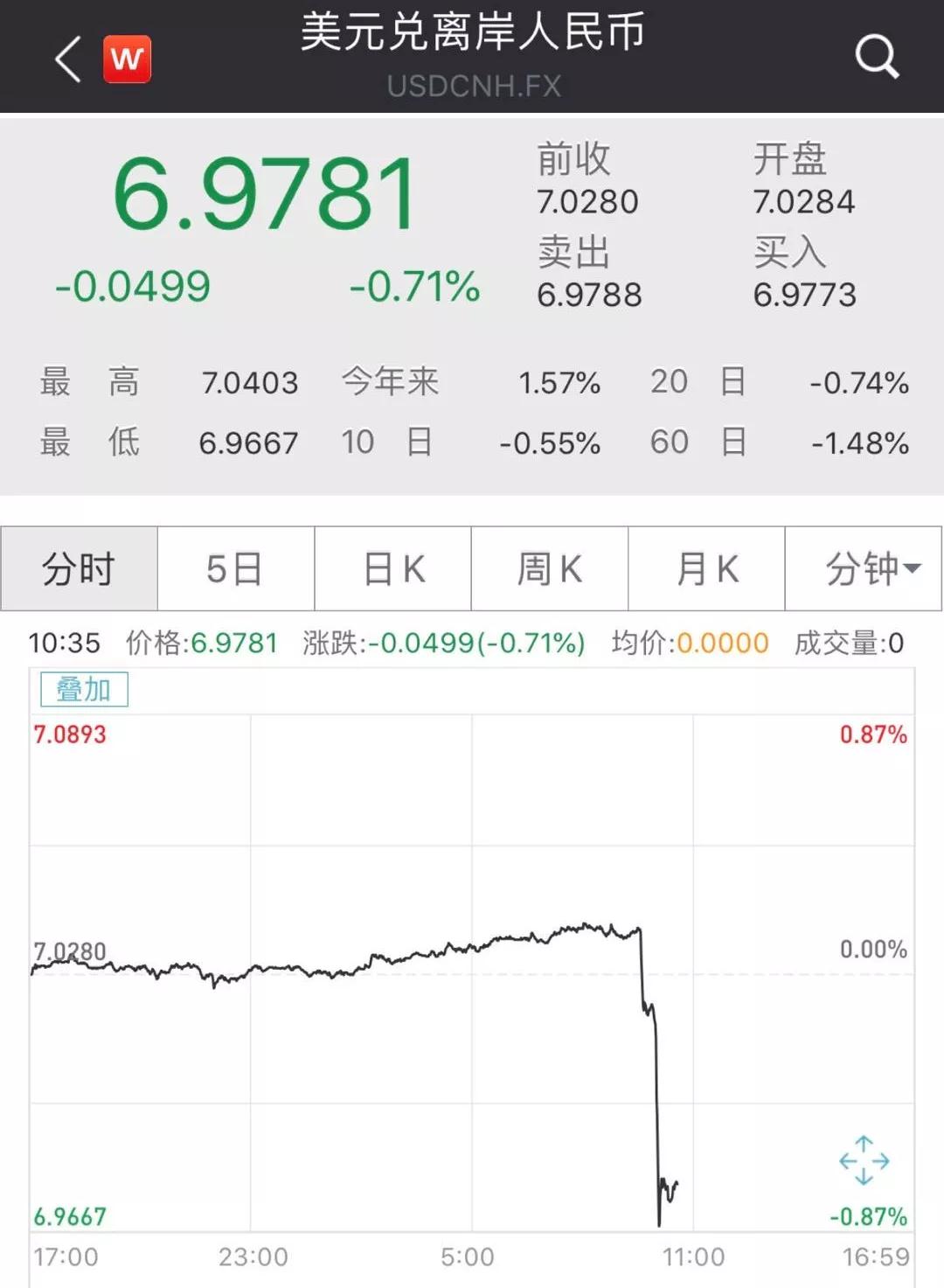 同時,離岸人民幣匯率方面,直接收復7.0關口重回6時代,盤中一下子漲了600多點。