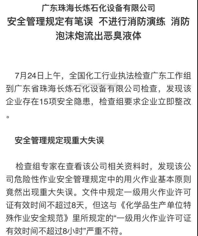 當時報道稱,當天檢查組在查看珠海長煉石化設備有限公司相關資料時,發現該企業危險性作業安全管理規定中的用火作業基本原則出現重大失誤。文件中規定一級用火作業許可證有效時間不超過8天,但這與《化學品生產單位特殊作業安全規范》里所規定的“一級用火作業許可證有效時間不超過8小時”嚴重不符。