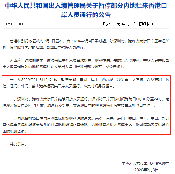 一、從2020年2月3日24時起,暫停羅湖、皇崗、福田、西九龍、沙頭角、文錦渡,以及高明、順德、江門、斗門、鶴山港客運碼頭口岸人員通行,恢復時間另行通告。