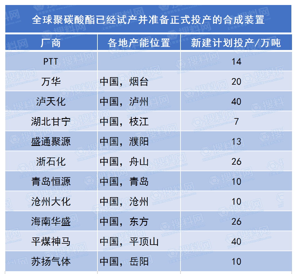 新增產能分別是2019年上半年,魯西化工在原有生產線基礎上,新增13.5萬噸/年產能,中藍國塑10萬噸/年PC裝置6月初宣布投產;2019下半年,湖北甘寧石化7萬噸/年PC裝置9月初投產成功,河南盛通聚源13萬噸/年PC裝置11月投產。