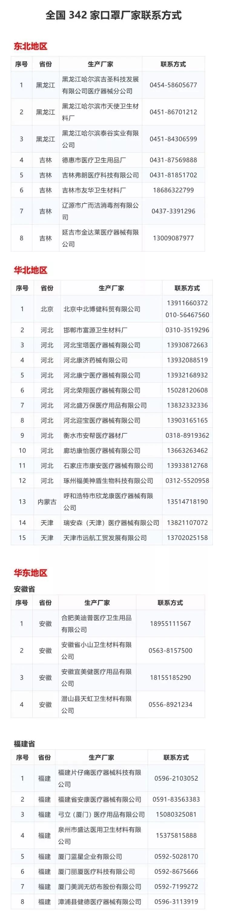 另外,全國342家口罩生產廠家聯系方式發給你們,請各企業積極聯系,爭取買到更多口罩,爭取早日開工。