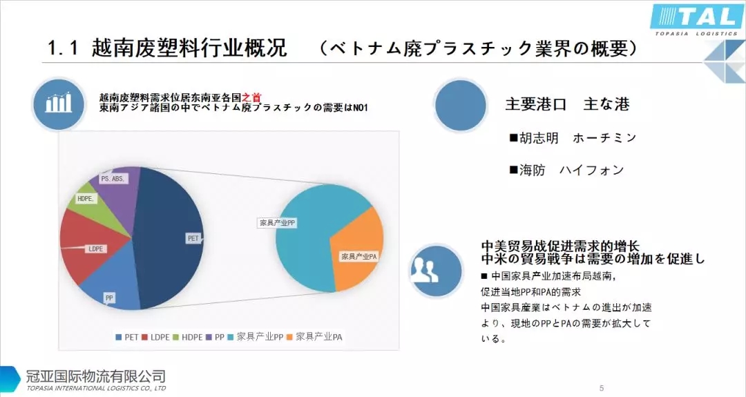 越南廢塑料需求位居東南亞各國之首,再生塑料在越南的市場有PET,PP,PE,PS,ABS,PA。主要進口港口:海防,胡志明。