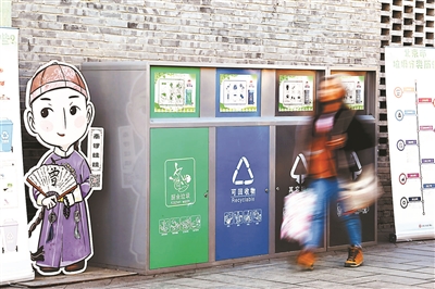 “南鑼地區(qū)有對稱的八條胡同,分類垃圾桶也相應(yīng)設(shè)置了八組,每組垃圾桶分為廚余垃圾、可回收物、其他垃圾三大類。由商戶志愿者擔(dān)任垃圾分類引導(dǎo)員,每天中午和晚上客流高峰時間上崗值守,幫助游客開展垃圾分類。有些游客吃完的竹簽子、一次性碗筷不知道怎么扔,志愿者會引導(dǎo)游客正確分類。” 南鑼鼓巷商會會長徐巖介紹,南鑼鼓巷第一個“吃螃蟹”,是全國首個引導(dǎo)游客開展垃圾分類的特色商業(yè)街。