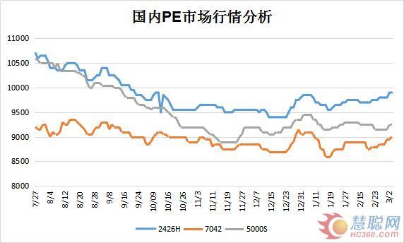 已有人閱讀此文 - -原油上漲,線性期貨高開震蕩小漲,國內PE市場走勢良好,行情局部走高。多數石化頻繁上調出廠價,炒作熱情高漲,商家積極跟漲出貨。但下游需求平淡,實盤走量不佳。主流價格:LDPE:9700-9900元/噸,LLDPE:9000-10000元/噸,HDPE:拉絲料9300-9400元/噸,注塑料8650-9250元/噸,薄膜料8800-9600元/噸,中空料8700-9500元/噸。