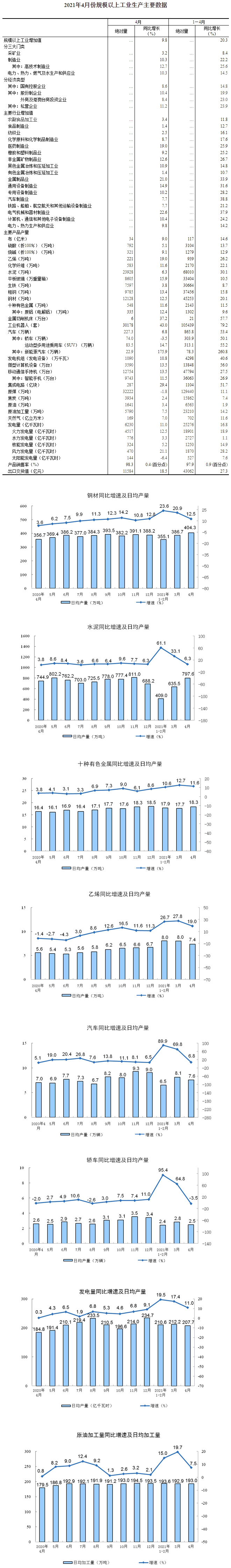 2021年4月份規模以上工業增加值增長9.8%