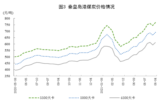 港口煤炭綜合交易價格繼續上漲。6月4日,秦皇島港5500、5000和4500大卡煤炭價格分別為每噸768元、690元、611元,比4月30日分別上漲78元、72元和62元。