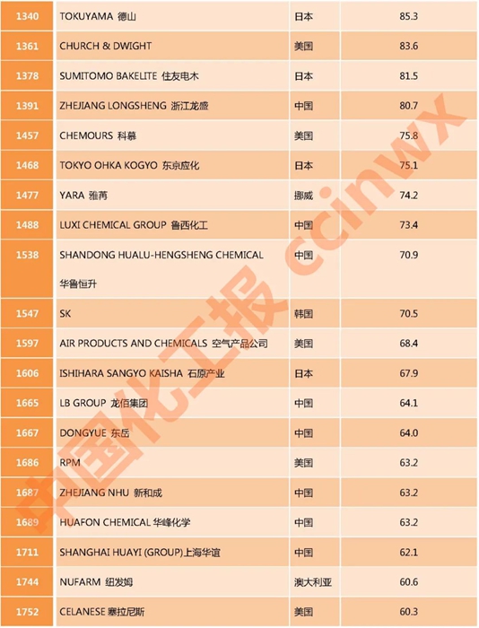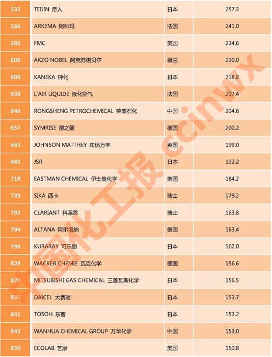 化工企業排名4~10位的依次是三菱化學(159)、科迪華(171)、旭化成(239)、杜邦(240)、陶氏(259)、東麗(305)、奇華頓(311)。