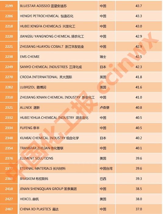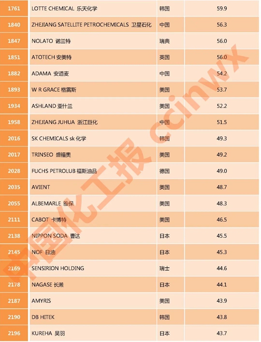 按國家和地區排名,2500強中的化企,日本有34家,中國有28家,美國有24家,歐洲28家,其他地區9家。