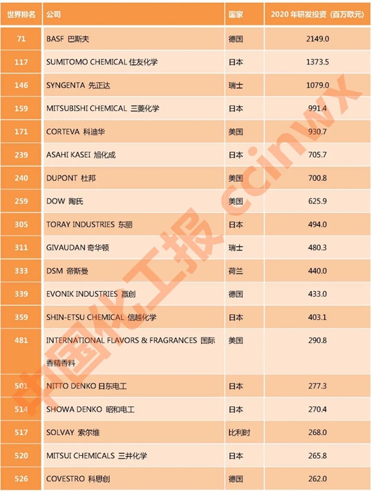 2020會計年度,巴斯夫繼續領跑化工行業,研發投入為21.5億歐元,位列71名;住友化學排名117位,研發投入為13.7億歐元;先正達位居146位,研發投入為10.8億歐元。