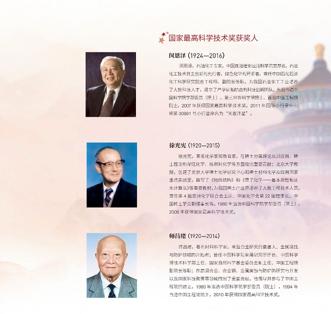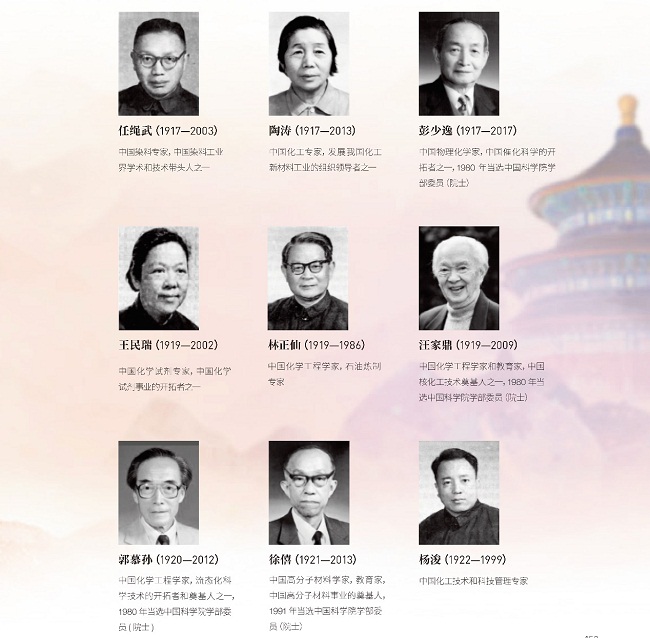 他們中,有化工先驅(qū)范旭東、侯德榜、吳蘊(yùn)初,有國家最高科學(xué)技術(shù)獎(jiǎng)獲得者閔恩澤、徐光憲、師昌緒、張存浩、屠呦呦,有時(shí)代楷模陳俊武,以及徐建寅、孫學(xué)悟等專家、院士。
