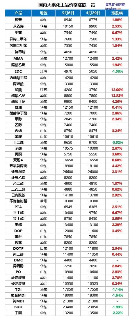 隨著復工復產加速推進,物流持續改善,市場心態得以提振,疊加節后補庫帶動市場需求回升,五一節后國內化工品市場多數上漲。據買化塑研究院監測的50種國內大宗化工產品價格,5月第一周上漲產品33個,下跌產品6個,持平產品11個;漲幅前三產品分別為醋酸乙酯↑12.82%、醋酸↑12.00%、正丁醇↑6.67%;跌幅前三產品分別為丁酮↓-2.22%、BDO↓-1.89%、聚合MDI↓-1.64%。