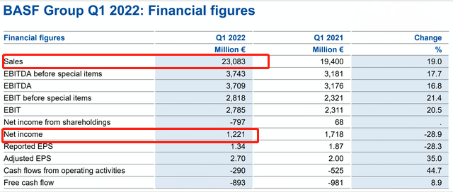 2022年一季度,巴斯夫實現營業收入230.83億歐元,同比增長19%;凈利潤12.21億歐元,同比下滑28.9%。