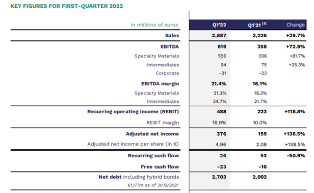 盡管原材料和能源成本高漲,但阿科瑪在第一季度仍取得了出色的業績表現。2022年一季度阿科瑪實現營業收入28.87億歐元,同比增長29.7%;調整后凈利潤為3.76億歐元,同比增長136.5%。