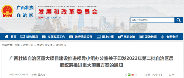 廣西自治區(qū)發(fā)改委在5月5日發(fā)布了《廣西壯族自治區(qū)重大項目建設(shè)推進領(lǐng)導(dǎo)小組辦公室關(guān)于印發(fā)2022年第二批自治區(qū)層面統(tǒng)籌推進重大項目方案的通知》。