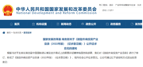 5月10日,國家發(fā)展改革委、商務部就《鼓勵外商投資產業(yè)目錄(2022年版)(征求意見稿)》公開征求意見,截止日期為2022年6月10日。
