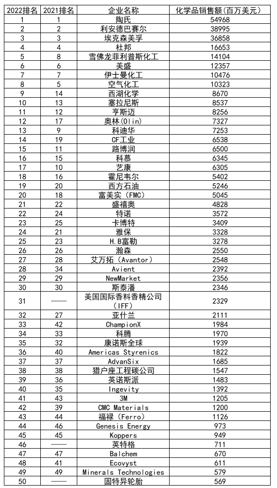 近日,《美國化學與工程新聞》(C&EN)公布了2022年美國化工企業(yè)50強。榜單顯示,陶氏、利安德巴賽爾、埃克森美孚依舊占據(jù)前三名。
