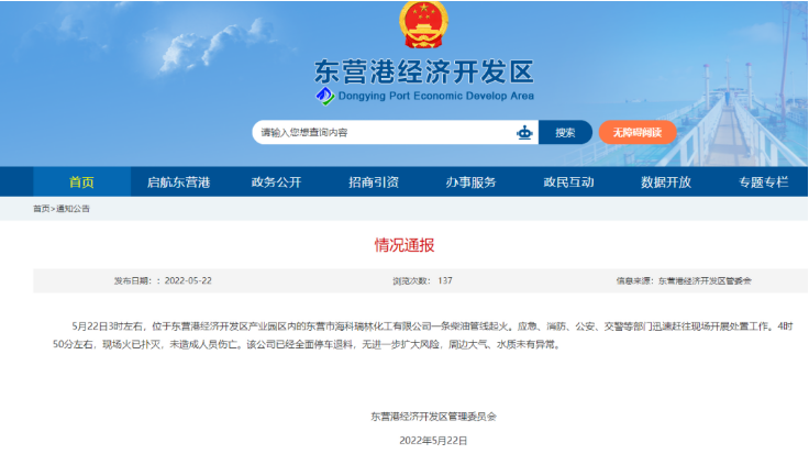5月22日3時左右,位于山東省東營港經(jīng)濟開發(fā)區(qū)產(chǎn)業(yè)園區(qū)內(nèi)的東營市海科瑞林化工有限公司一條柴油管線起火。應(yīng)急、消防、公安、交警等部門迅速趕往現(xiàn)場開展處置工作。4時50分左右,現(xiàn)場火已撲滅,未造成人員傷亡。該公司已經(jīng)全面停車退料,無進一步擴大風(fēng)險,周邊大氣、水質(zhì)未有異常。