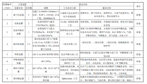 其中,主要工程包括:氣化裝置、變換裝置、低溫甲醇洗裝置、硫回收裝置、甲醇合成裝置、甲醇制烯烴裝置、烯烴分離裝置、聚乙烯裝置、聚丙烯裝置、三元乙丙橡膠裝置、電解水裝置。