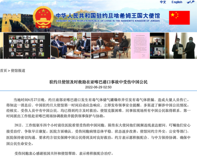 中國大使館表示有中國公民在約旦亞喀巴發生的化學氣體泄漏事故中受