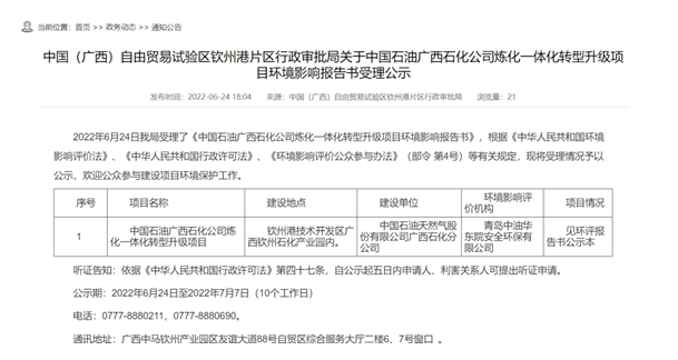 6月24日,中國石油廣西煉化一體化環(huán)境影響報告獲得受理。同時,中國(廣西)自由貿(mào)易試驗區(qū)欽州港區(qū)管理委員會官網(wǎng)發(fā)布了該項目的環(huán)境影響報告書(公示版)。