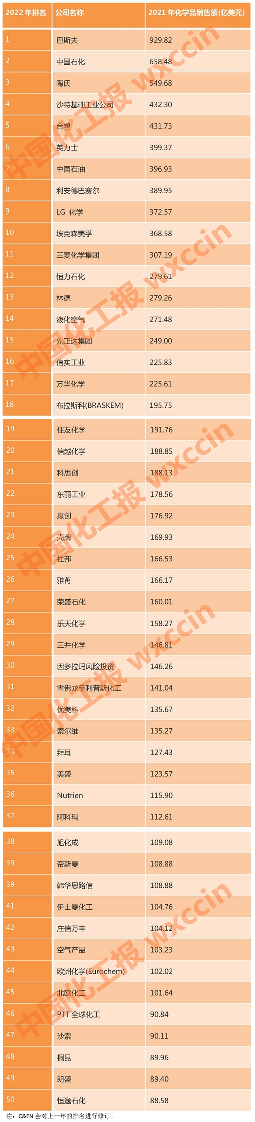 2022年全球50強化工公布:中國石化、中國石油、恒力、萬華、榮盛上榜