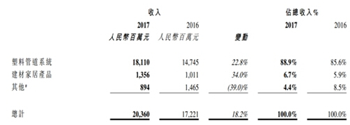 在本次調查中,中國聯塑監事會主席兼行政總裁左滿倫表明,企業17年各版塊持續增長,預估2018總體收入會持續保持穩進的提高,而建材家居商品和其他業務因為數量較低,可能維持持續增長。