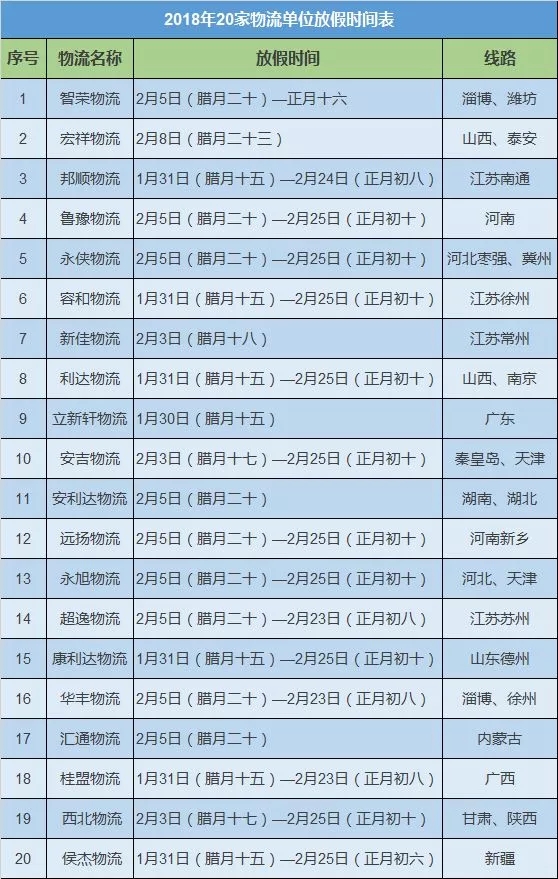 以往看來(lái),物流企業(yè)一般都會(huì)臘月二十上下放假了,比照2020年便是陽(yáng)歷2月5號(hào)上下。可是2020年?duì)顩r各有不同: