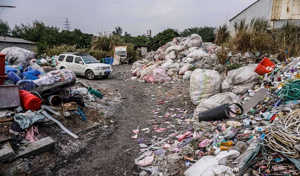 化工桶、機油桶、廢料油箱、洗發液沐浴乳玻璃瓶……這不是商場,只是堆積在羅山街道社區內塘小區英子山旁的廢塑。順著晃動的小道走動,一眼放眼望去,簡單加建而成的工業廠房有五六家,多種類型的廢塑隨處可見,令人震驚。
