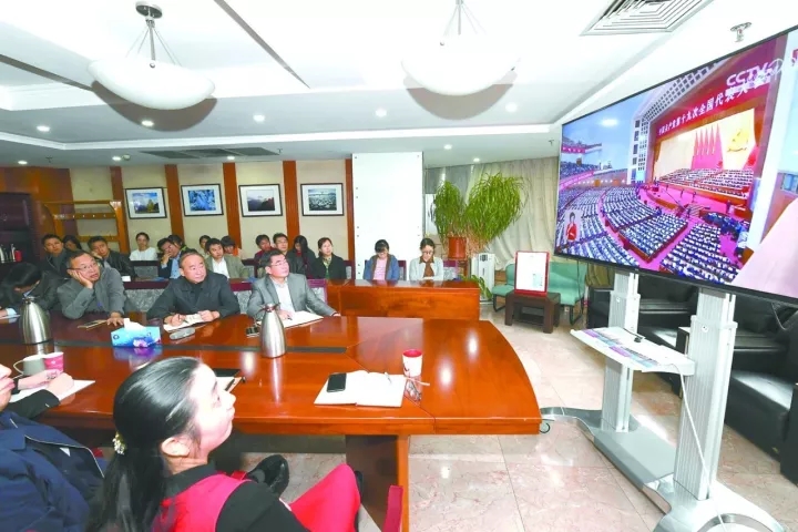 陜西省未來新能源化工公司分六個主會場,另外充分利用網絡、app客戶端等,總共機構六百七十余人集中化收看接聽十九大開幕會直播間,占該企業在籍總人數的百分之三十五。圖為收看現場直播。