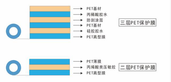 普遍的防護膜是由超全透明pvc膜(PET)做為基膜,經涂布線涂布獨特的硅橡膠或亞克力膠,再迎合PETpet保護膜,并針對硬底化解決面再迎合PET防護膜所構成的。