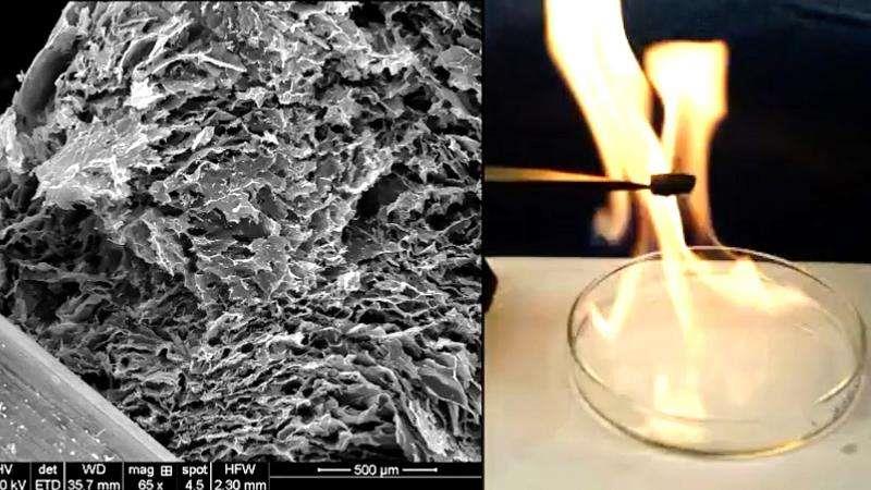 已有人閱讀此文 - -最近,一種新的復合材料問世,其具備超輕巧、超延展性、阻燃等級好及其可變成各種各樣運用理想化挑選的別的特性等優(yōu)勢。 圖中左邊為掃描儀透射電鏡下觀查到的原材料外部經濟形狀,另外右邊表明對其阻燃等級的檢測。 圖片出處:普渡大學